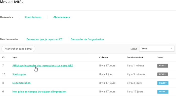 Tant que votre demande n'a pas été traitée, le statut qui lui est attribué est Ouvert ou En attente de réponse.