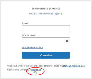 Dans l'interface Se connecter à Doxense, cliquez sur le lien Inscription :