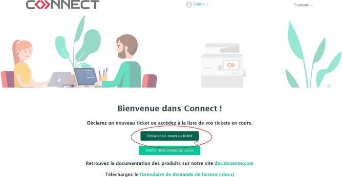 Une fois le formulaire prêt, depuis l'interface Bienvenue dans Connect, cliquez sur le bouton Déclarer un nouveau ticket :