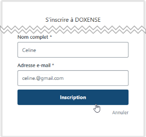 Dans l'interface S'inscrire à Doxense, saisissez votre nom complet (prénom + nom) et votre adresse de messagerie :
