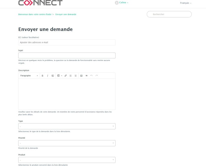 Dans le formulaire de demande Connect, sélectionnez dans la liste le produit concerné ainsi que le type Tâche.