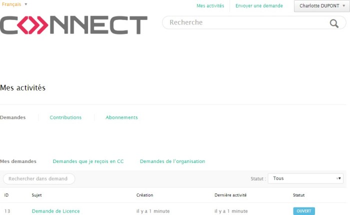 La demande envoyée s'inscrit dans la liste Mes demandes affichée dans le portail Connect.