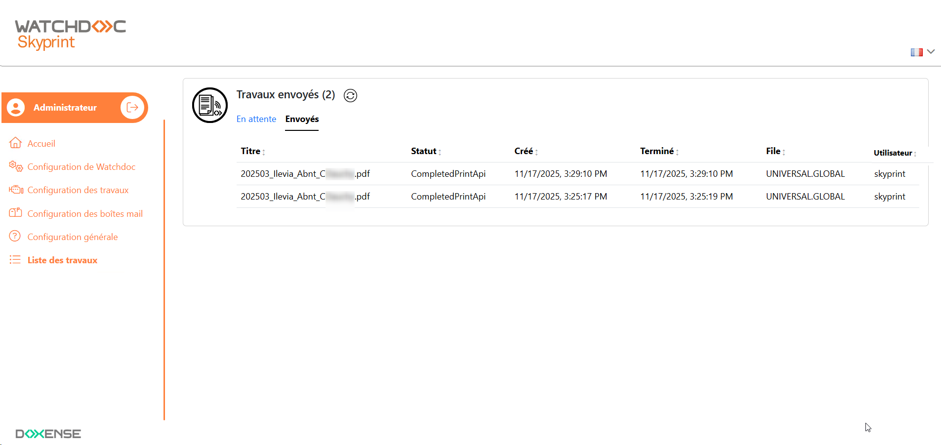 sous l'onglet Envoyés figurent les travaux envoyés à Skyprint puis traités par Watchdoc.