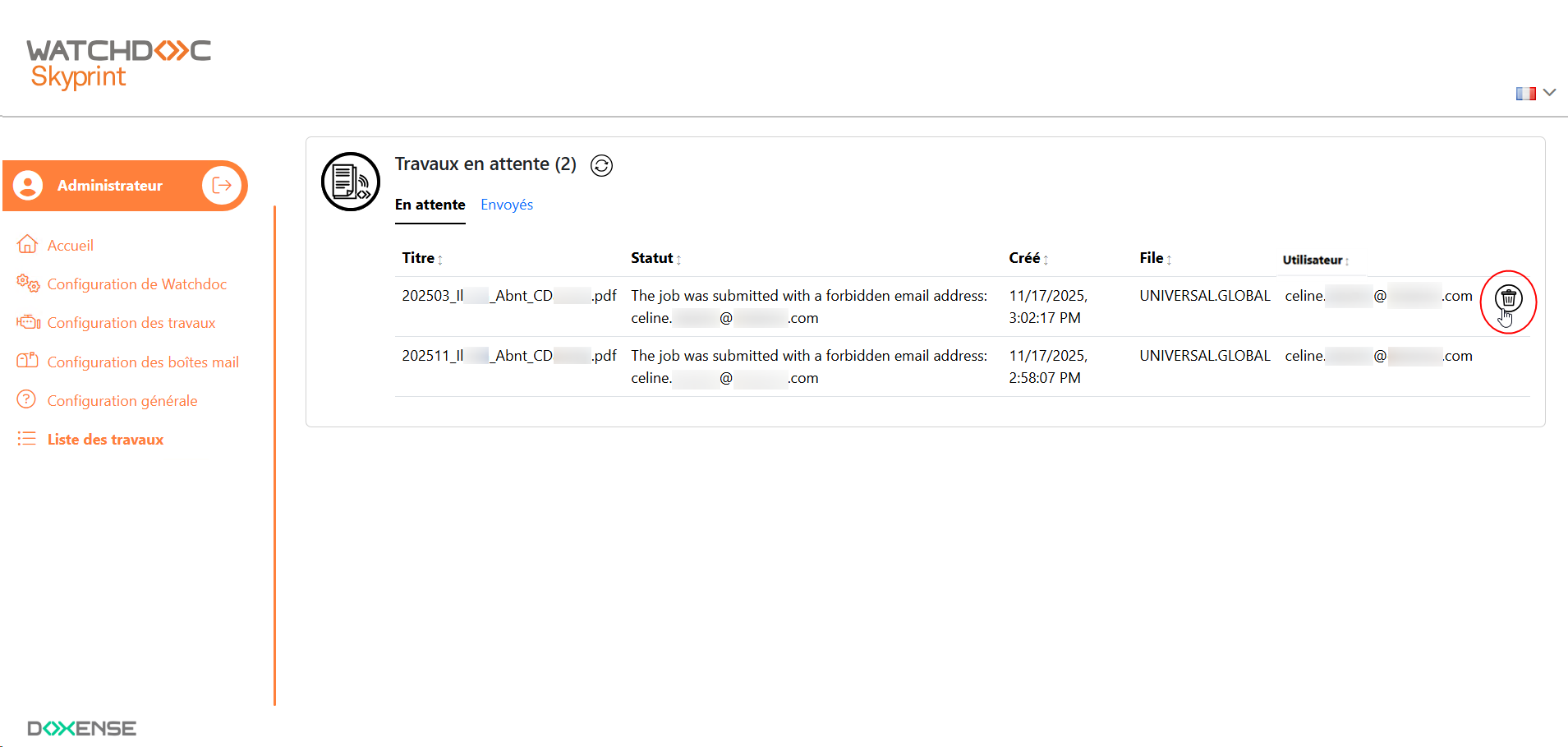 Les travaux figurant dans cette liste sont les demandes d'impression prises en charge par Skyprint, mais pas encore traitées par Watchdoc.