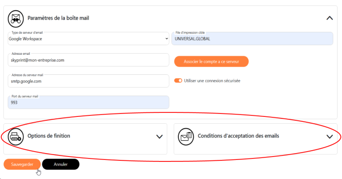 Cependant, vous pouvez aussi configurer des options de finition et conditions d'acceptation spécifiques pour la boîte mail en cours de configuration :