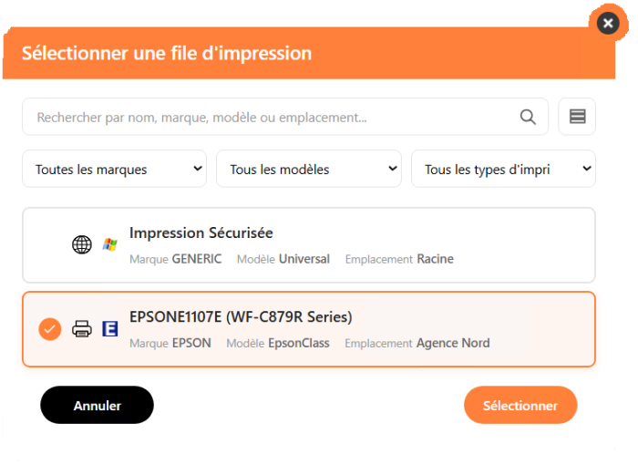 dans le champ, saisissez un critère de recherche permettant de trouver la file d'impression (modèle, marque, élément saisi dans les propriétés de la file) ;