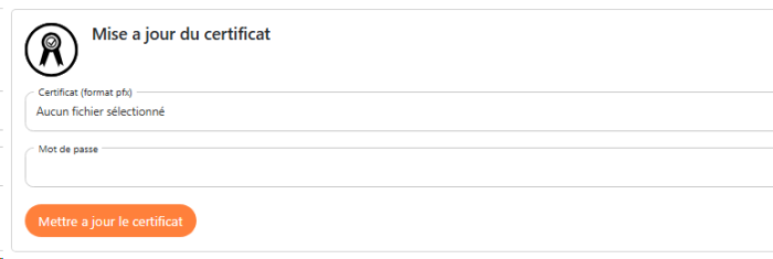 Dans la section Mise à jour du certificat, cliquez dans le champ de saisie Certificat pfx pour parcourir l'espace de travail à la recherche du certificat .pfx là où il est enregistré.