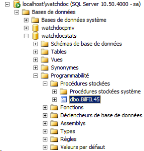 vérifiez que la procédure stockée a bien été installée en déployant l'arborescence représentant la base de données watchdocstats :