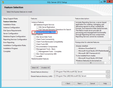 dans la boîte de sélection des fonctionnalités (Feature Selection), cochez la case Instance Feature > Reporting Services - Native :