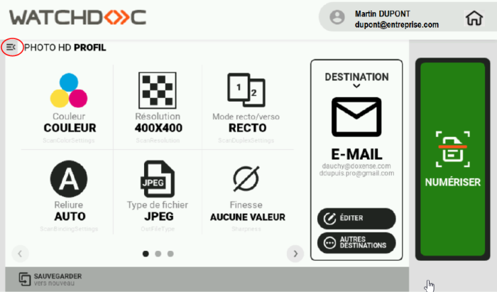 Numériser vers mon email : envoi vers l’email associé à mon compte utilisateur :