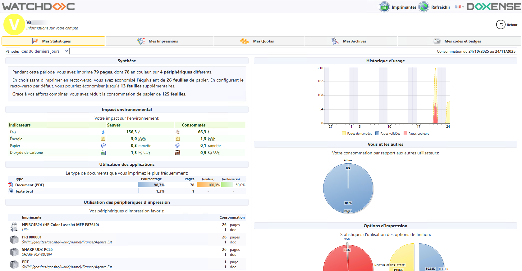 cliquez sur l'onglet Mes Statistiques : vous accédez à une interface qui affichent vos données d'usage de Watchdoc et l'impact environnemental qui en découle :
