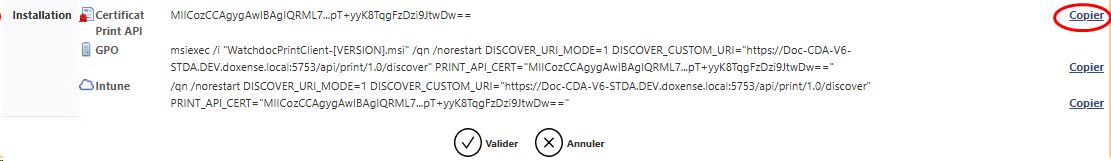 dans la configuration Client Windows, section Installation, copiez le Certificat Print API :