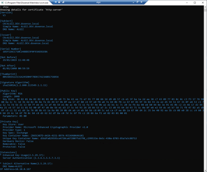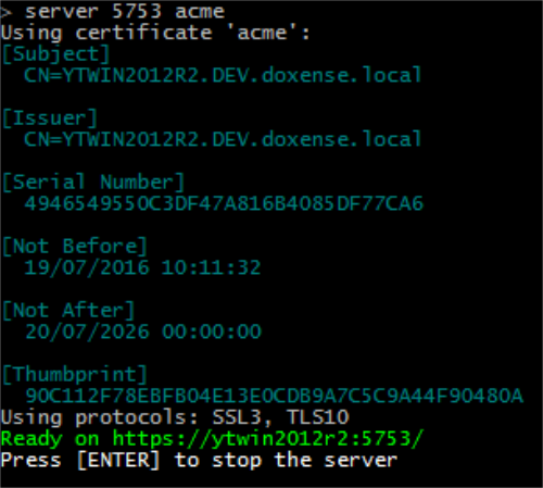 le nom de domaine dshou certificat (ex. : CN= YTWIN2012R2.DEV.doxense.local).