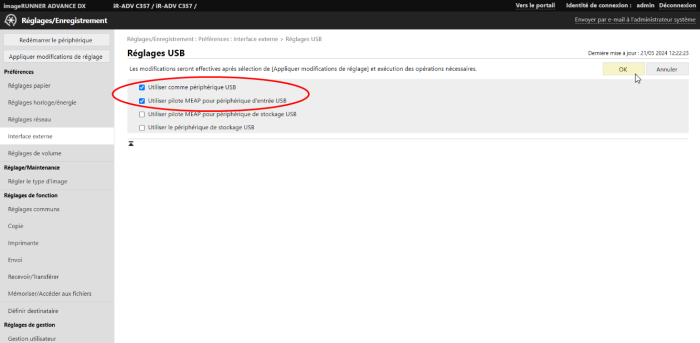 Si le périphérique d'impression autorise la connexion de périphériques de stockage ou d'un lecteur de badges USB, il convient de configurer les paramètres USB :