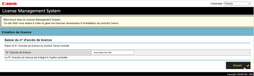 Rendez-vous sur le site de Canon https://c-lms.com/license/enduser/portal/LAInput.jsp.