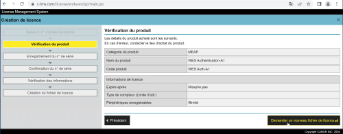 dans l'interface Vérification du produit, cliquez sur le bouton Demander un nouveau fichier de licence ;
