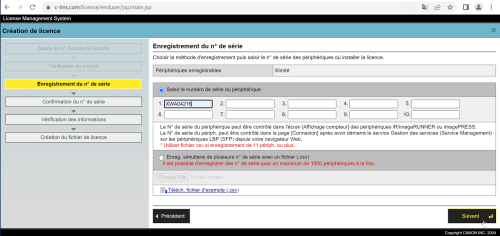 Dans l'interface Enregistrement du n° de série, saisissez le ou les numéros des périphériques sur lesquels le WES sera installé, puis cliquez sur Suivant. Au-delà de 10 périphériques concernés, il convient d'importer les numéros de série enregistrés dans un ficheir .csv) .