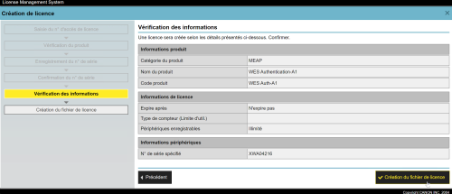 Dans l'interface Vérification des informations, cliquez sur le bouton Création du fichier de licence après avoir validé les informations saisies.