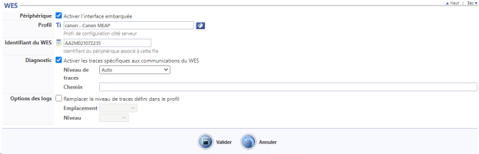 Activer l'interface embarquée : cochez la case pour appliquer un WES sur le périphérique.