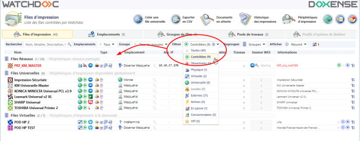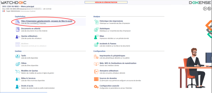 Depuis le Menu principal de l'interface d'administration Watchoc, section Exploitation, cliquez sur Files d'impression, groupes de files & pools :