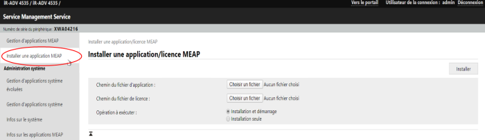 Dans le portail SMS, cliquez sur l'entrée de menu Installer une application MEAP ;
