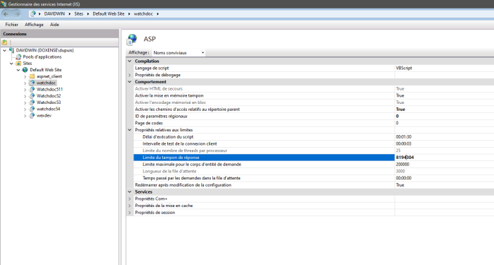 Pour permettre le téléchargement des fichiers d'installation Canon, la limite de tampon de réponse du serveur Web IIS doit être est suffisante.