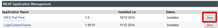 Dans l'interface MEAP Application Management, , cliquez sur Start pour démémarrer l'application de déblocage des impressions WES Pull Print :