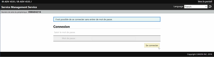 authentifiez-vous à l'aide des compte et mot de passe d'administration fournis par Canon® (ou cliquez sur Se connecter si les champs de saisie sont inactifs) ;