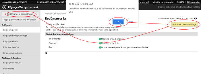 confirmez 2 fois le redémarrage du périphérique (un message vous informe que les travaux en cours seront perdus) ;