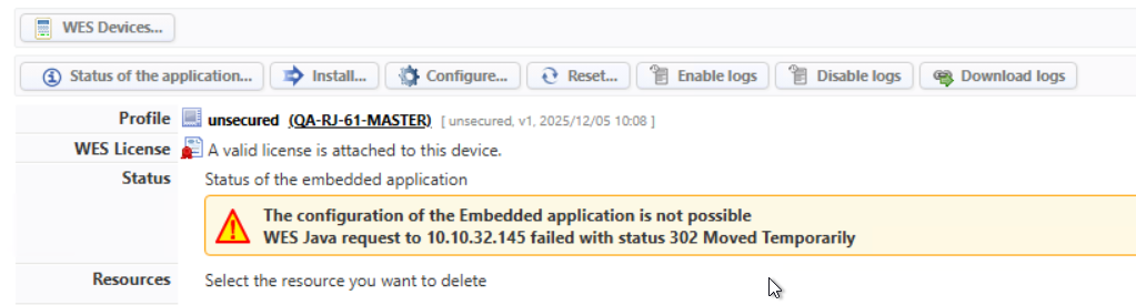 Lors de l'installation du WES, un message d'alerte s'affiche dans la section Statut : The configuration of the Embedded application is not possible. WES Java request to [IP du serveur] failed with status 302 Moved Temporarily :
