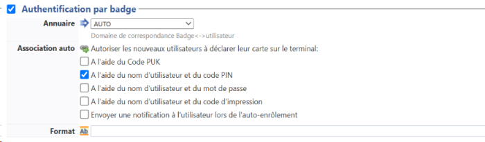 Authentification par badge : cochez la case pour autoriser l'authentification de l'utilisateur à l'aide d'un badge, puis précisez les modalités de cette authentification :