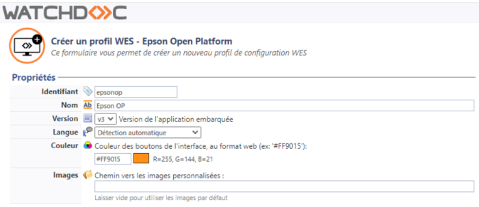 Images : si vous souhaitez personnaliser les images WES, entrez le chemin du dossier dans lequel sont enregistrées les images que vous souhaitez afficher à la place des images par défaut (stockées dans C:\Program Files\Doxense\Watchdoc\Images\Embedded\Brands\[Nom_du_fabricant] par défaut).
