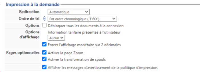 Dans cette section, vous précisez les paramètres liés à la fonction d'impression à la demande, c'est-à-dire l'interface depuis laquelle l'utilisateur accède à ses travaux en attente et depuis laquelle il supprime ou valide les impressions :
