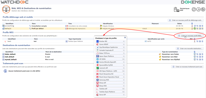 Lors d'une installation initiale de Watchdoc, un profil WES peut être automatiquement créé et configuré à l'aide de paramètres par défaut par l'assistant d'installation. Outre ce premier profil WES par défaut, vous pouvez ajouter autant d'autres profils WES que nécessaires.