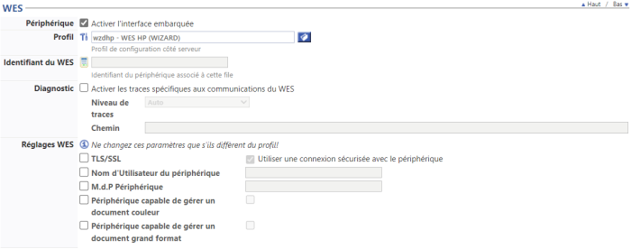 Dans cette section, vous configurez les paramètres de connexion entre le WES et Watchdoc dans le cas où ces paramètres sont spécifiques à ce périphérique et ne doit donc pas tenir compte du paramétrage du WES. Sans modification, c'est la configuration du WES qui s'applique.