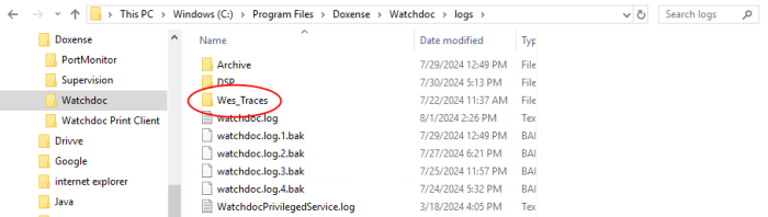 sur leserveur hébergeant Watchdoc, accédez au fichier traces(log) du périphérique d'impression (stocké par défaut dans C:\Program Files\Doxense\Watchdoc\logs\Wes_Traces) ;