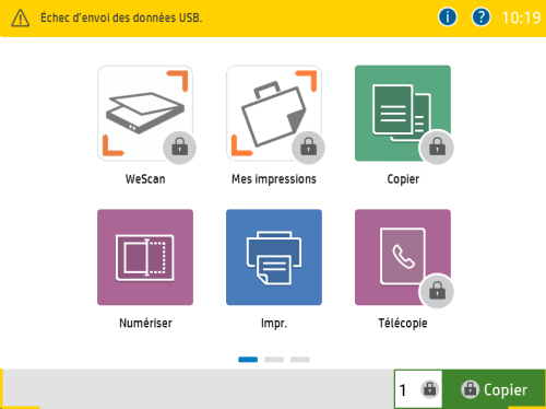 Après un incident interrompant la connexion entre le périphérique d'impression et le serveur ou entre le périphérique et la base de données, alors que la connexion est rétablie, le message Echec d'envoi des données USB s'affiche sur les écrans des périphériques équipés d'un lecteur de badge :