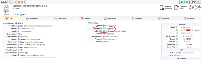 depuis les informations générales de la file d'impression, cliquez sur l'adresse IP du périphérique :
