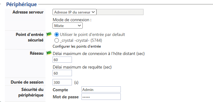 Point d'entrée sécurisé : si vous avez sélectionné un mode de connexion SSL ou Mixte (depuis v. 6.1.0.5262), vous pouvez préciser le point d'accès que vous souhaitez utiliser. Le nombre de points d'entrée figurant dans la liste varie en fonction de ceux qui ont été préalablement configurés dans l'interface Serveur Web, section DSP (cf. Configurer le Serveur web). Si vous n'avez pas configuré ces points d'entrée préalablement, cliquez sur Configurer les points d'entrée.