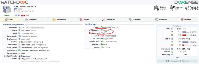 Dans l'interface de configuration de la file, sous l'onglet Etat, dans la section Monitoring, cliquez sur l'adresse IP du périphérique :