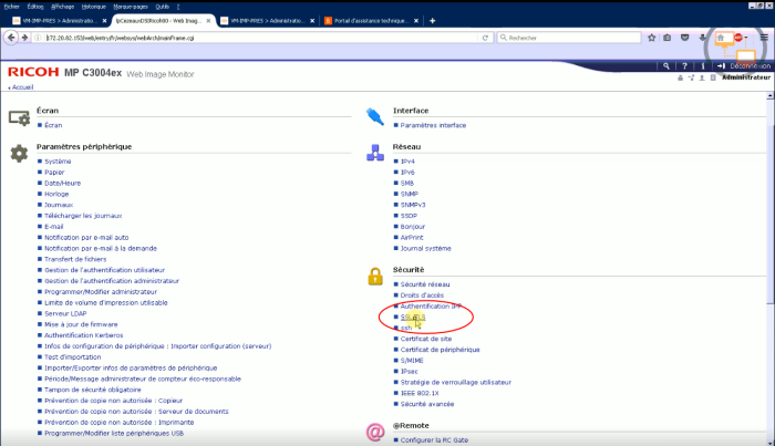 depuis l'interface d'administration du périphérique Web Image Monitor, cliquez sur le menu Gestion de périphérique>Gestion d'écran ;