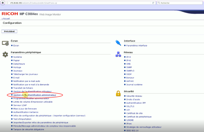 depuis l'interface Web Image Monitor > Configuration, cliquez sur le bouton Précédent ;