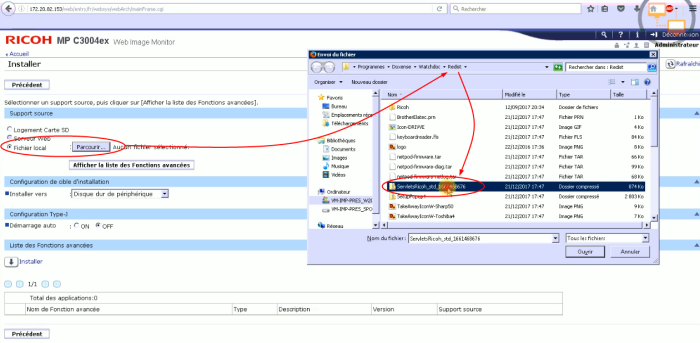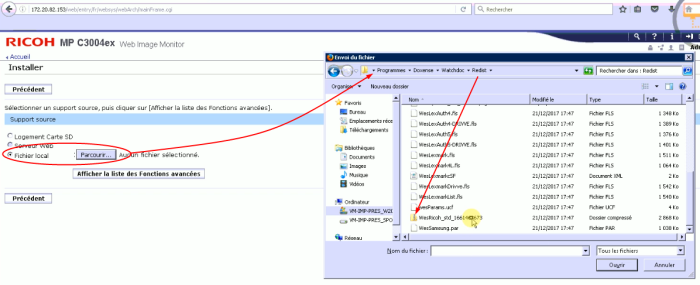 dans la fenêtre de sélection, parcourez votre environnement de travail pour sélectionner le fichier d'installation du WES Ricoh dans ...\Programmes\Doxense\Watchdoc\Redist par défaut) :