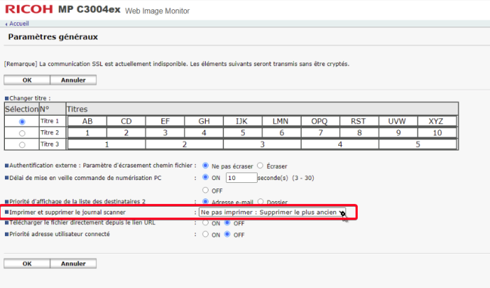 Pour le paramètre Imprimer et supprimer le journal scanner, sélectionnez : Ne pas imprimer : supprimer le plus ancien :