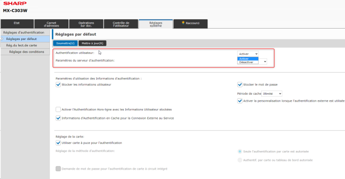 dans l'interface Réglages par défaut > Authentification utilisateur, sélectionnez Activer :