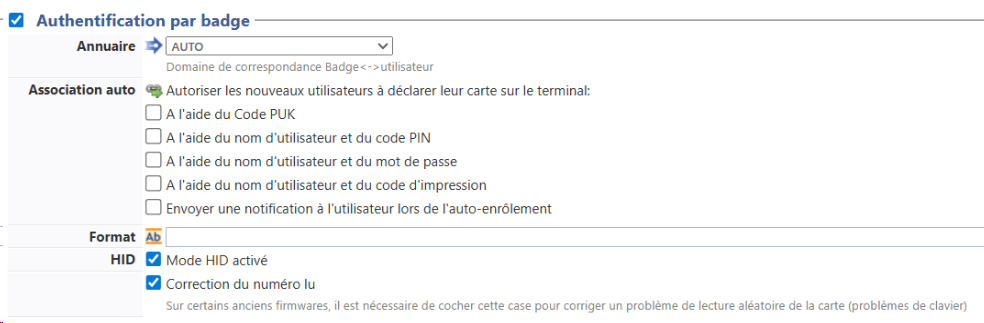 Authentification par badge : cochez la case pour autoriser l'authentification de l'utilisateur à l'aide d'un badge, puis précisez les modalités de cette authentification :