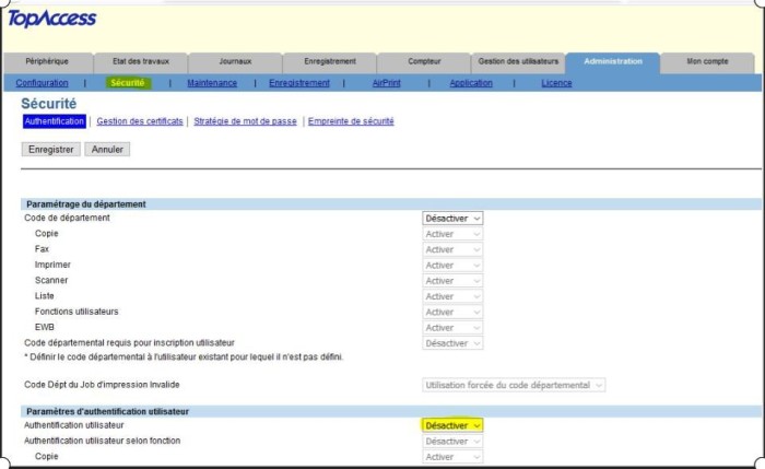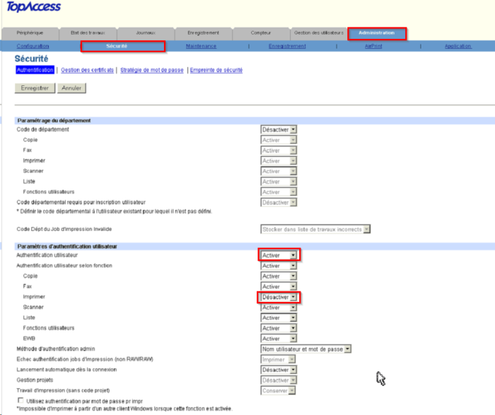 Pour résoudre ce problème, vous devez désactiver l'authentification utilisateur pour l'impression sur le périphérique :
