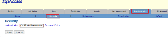 dans le site web d'administration du périphérique Toshiba, rendez-vous ans l'onglet Administration > Security > section Certificate Management :