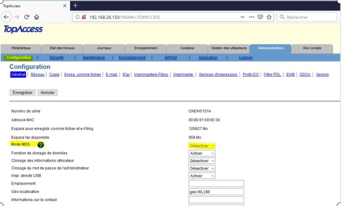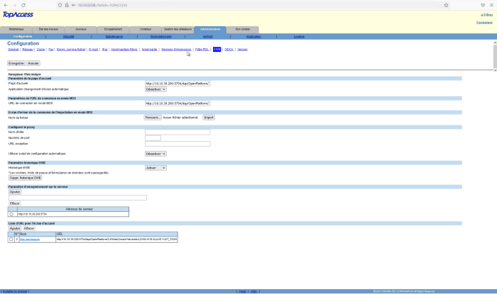 à l'aide d'un navigateur, accédez à l'interface d'administration du périphérique (TopAccess) ;