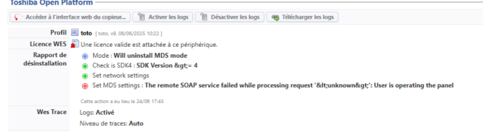Lors de la désinstallation du WES Toshiba Open Platform, l'opération se déroule bien jusqu'à la ligne Set MDS settings qui affiche le message d'erreur suivant : The remote SOAP service failed while processing request '<unknown>': User is operating the panel: